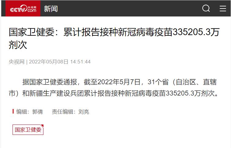 据国家卫健委通报,截至2022年5月7日,31个省(自治区、直辖市)和新疆生产建设兵团累计报告接种新冠病毒疫苗335205.3万剂次。