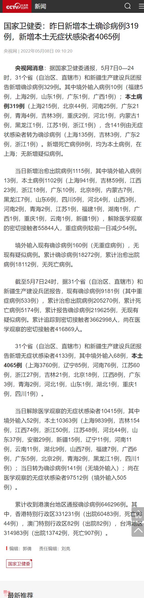 央视网消息:据国家卫健委通报,5月7日0—24时,31个省(自治区、直辖市)和新疆生产建设兵团报告新增确诊病例329例。其中境外输入病例10例(福建5例,上海2例,山东1例,广东1例,广西1例);本土病例319例(上海215例,北京44例,河南25例,广东21例,青海4例,吉林3例,重庆2例,河北1例,内蒙古1例,黑龙江1例,江苏1例,浙江1例),含141例由无症状感染者转为确诊病例(上海135例,吉林3例,广东2例,浙江1例)。新增死亡病例8例,均为本土病例,在上海;无新增疑似病例。