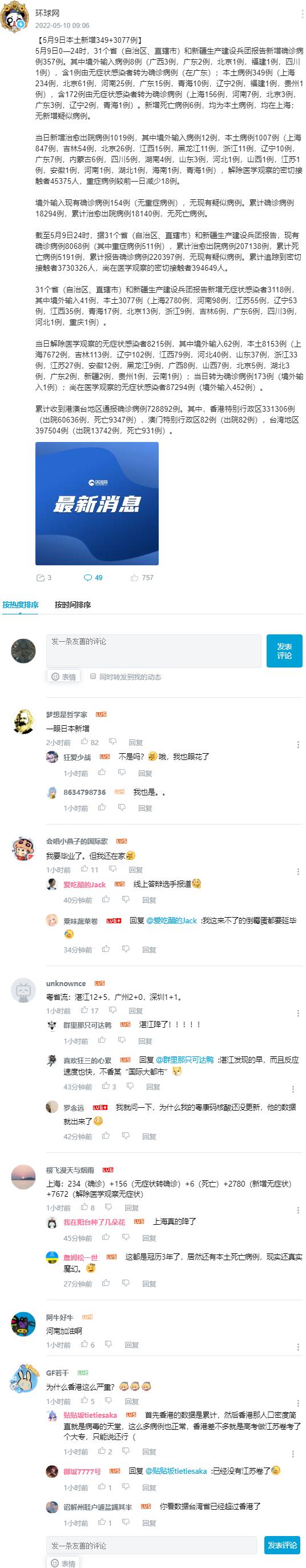 ★★★ 5月9日本土新增349+3077例