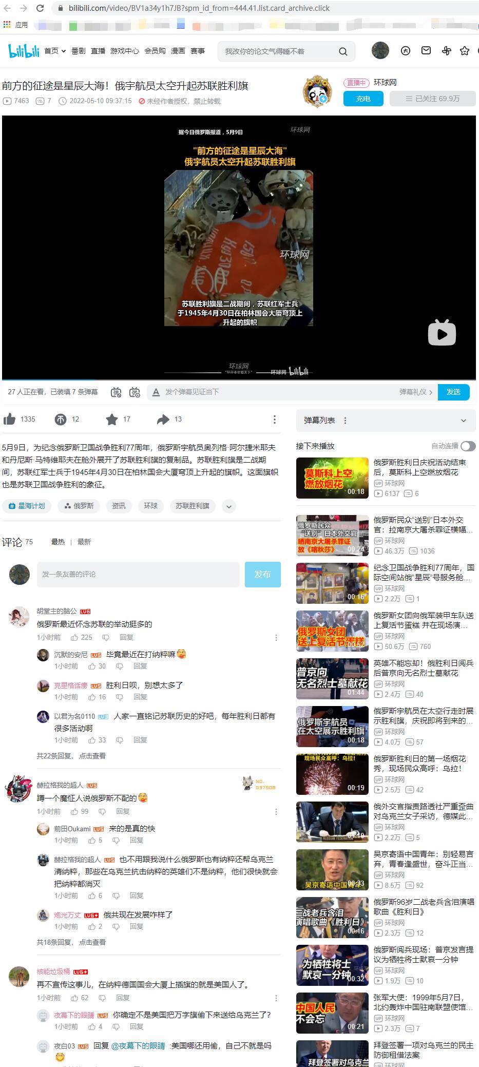 5月9日,为纪念俄罗斯卫国战争胜利77周年,俄罗斯宇航员奥列格·阿尔捷米耶夫和丹尼斯·马特维耶夫在舱外展开了苏联胜利旗的复制品。苏联胜利旗是二战期间,苏联红军士兵于1945年4月30日在柏林国会大厦穹顶上升起的旗帜。这面旗帜也是苏联卫国战争胜利的象征。
