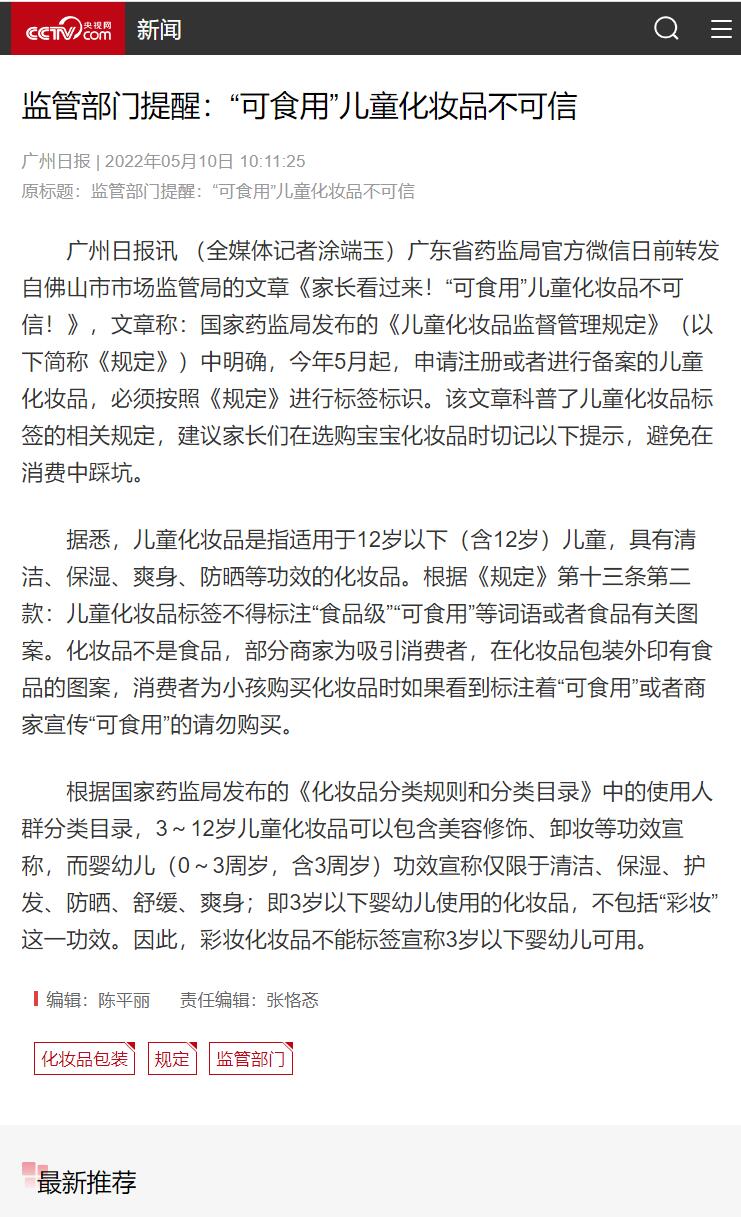 ★★★ 监管部门提醒:“可食用”儿童化妆品不可信