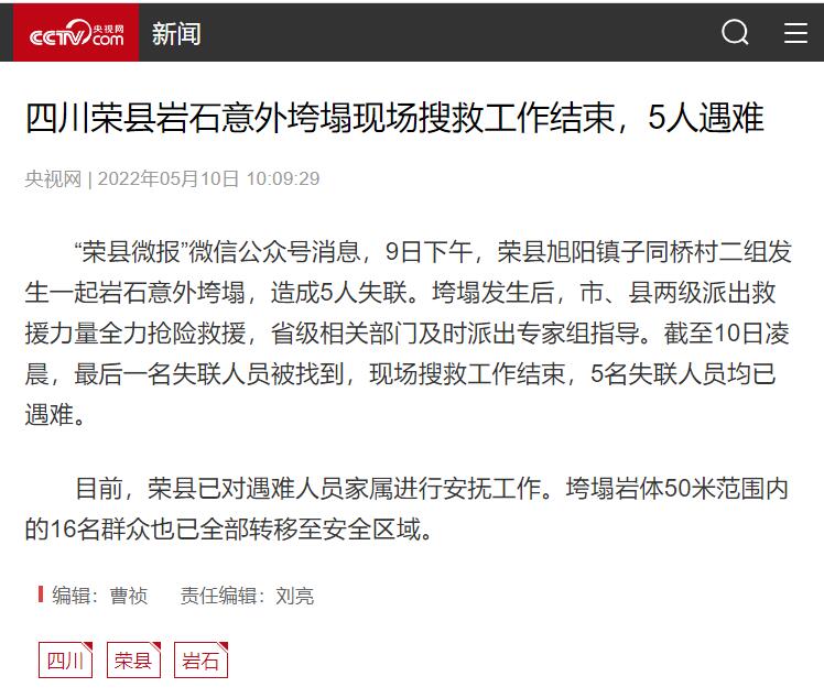 ★★★ 四川荣县岩石意外垮塌现场搜救工作结束,5人遇难