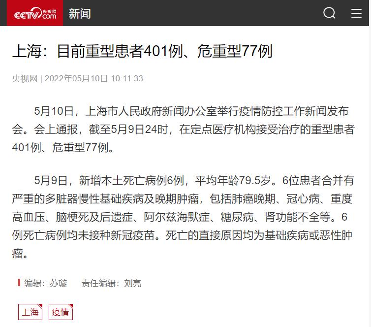 5月10日,上海市人民政府新闻办公室举行疫情防控工作新闻发布会。会上通报,截至5月9日24时,在定点医疗机构接受治疗的重型患者401例、危重型77例。