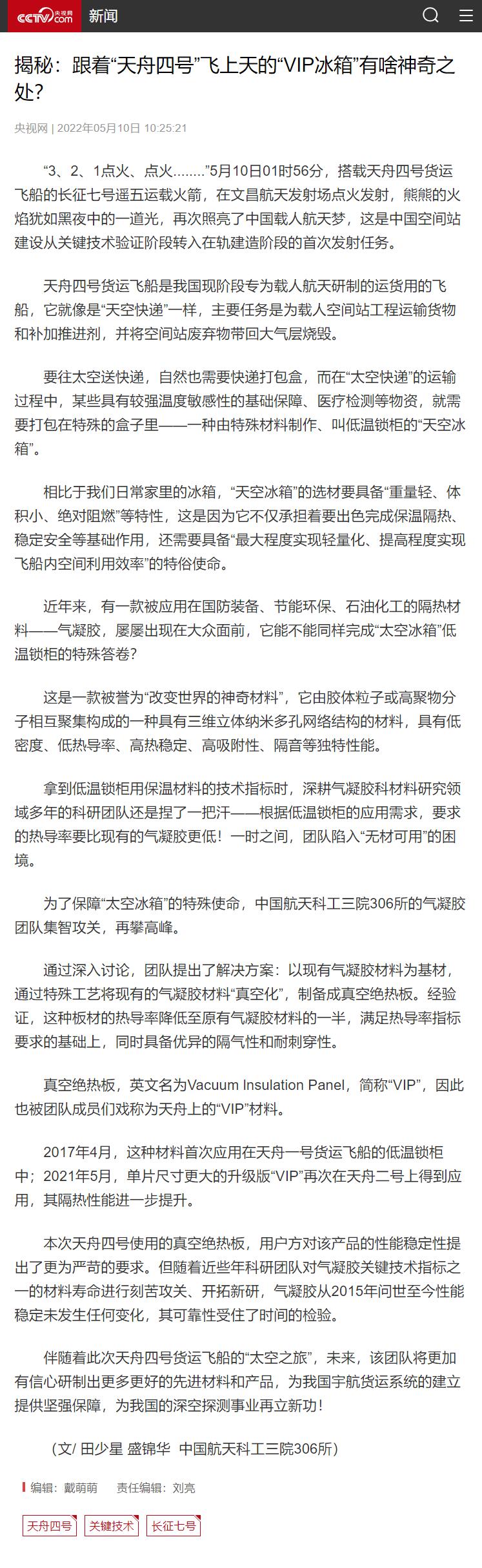 2017年4月,这种材料首次应用在天舟一号货运飞船的低温锁柜中;2021年5月,单片尺寸更大的升级版“VIP”再次在天舟二号上得到应用,其隔热性能进一步提升。