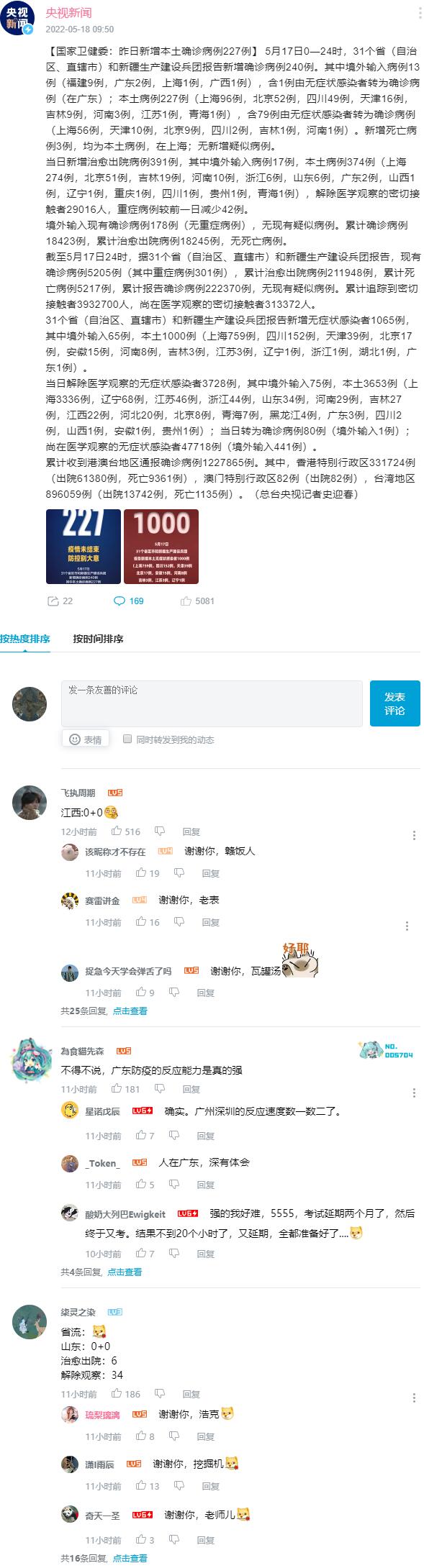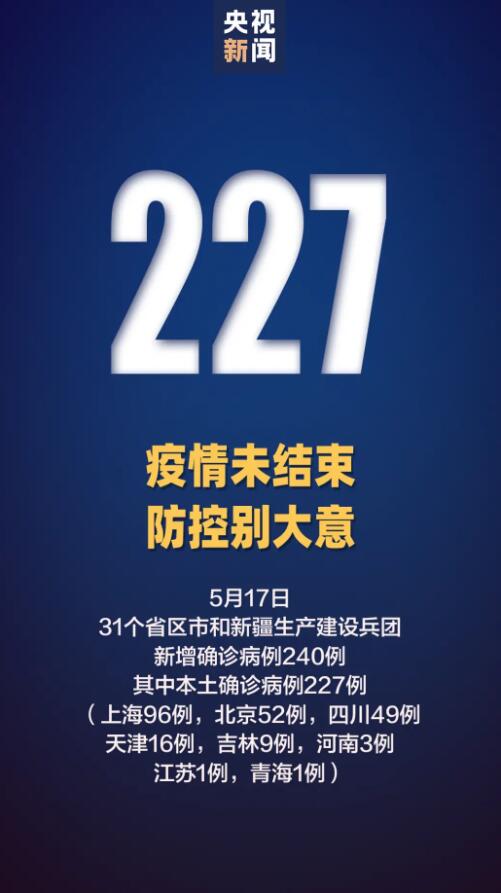 【国家卫健委:昨日新增本土确诊病例227例】 5月17日0—24时,31个省(自治区、直辖市)和新疆生产建设兵团报告新增确诊病例240例。其中境外输入病例13例(福建9例,广东2例,上海1例,广西1例),含1例由无症状感染者转为确诊病例(在广东);本土病例227例(上海96例,北京52例,四川49例,天津16例,吉林9例,河南3例,江苏1例,青海1例),含79例由无症状感染者转为确诊病例(上海56例,天津10例,北京9例,四川2例,吉林1例,河南1例)。新增死亡病例3例,均为本土病例,在上海;无新增疑似病例。