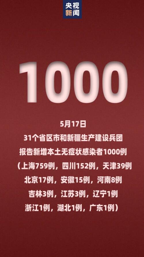 31个省(自治区、直辖市)和新疆生产建设兵团报告新增无症状感染者1065例,其中境外输入65例,本土1000例(上海759例,四川152例,天津39例,北京17例,安徽15例,河南8例,吉林3例,江苏3例,辽宁1例,浙江1例,湖北1例,广东1例)。