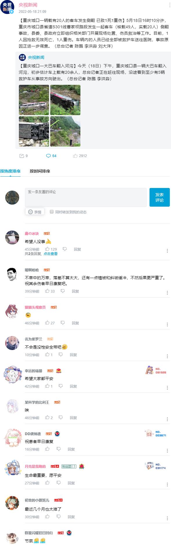 【重庆城口一辆载有20人的客车发生侧翻 已致1死1重伤】5月18日16时10分许,重庆市城口县省道S301线曹家坝路段发生一起客车(核载49人,实载20人)侧翻事故,县委、县政府立即组织相关部门开展现场处置、伤员救治等工作。目前,1人因抢救无效死亡,1人重伤。车辆内的人员已经全部被救护车送往医院,事故原因正进一步调查。(总台记者 陈鹏 李洪淼 刘大洋)