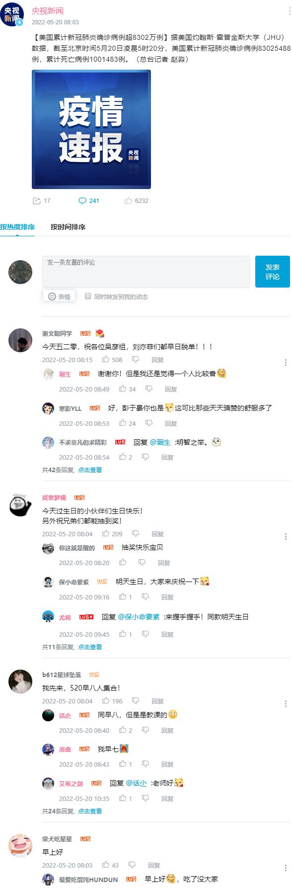 【美国累计新冠肺炎确诊病例超8302万例】据美国约翰斯·霍普金斯大学(JHU)数据,截至北京时间5月20日凌晨5时20分,美国累计新冠肺炎确诊病例83025488例,累计死亡病例1001483例。(总台记者 赵淼)