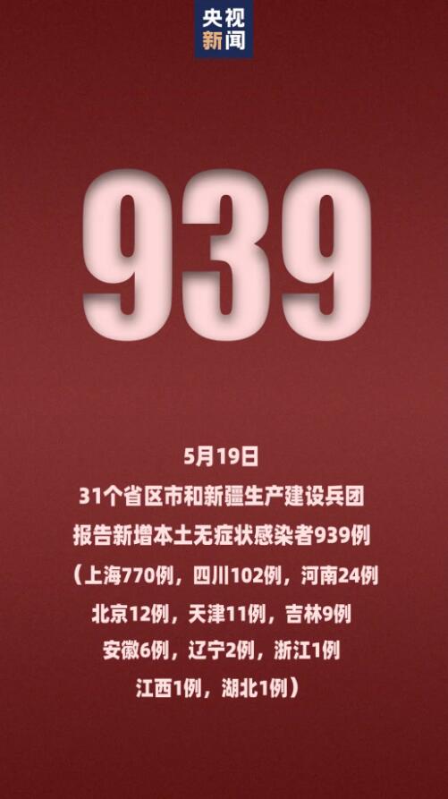 【5月19日新增本土确诊176例 新增本土无症状939例】5月19日0—24时,31个省(自治区、直辖市)和新疆生产建设兵团报告新增确诊病例193例。其中境外输入病例17例(福建9例,上海2例,江苏2例,广西2例,北京1例,云南1例);本土病例176例(上海88例,北京50例,四川20例,天津8例,河南4例,广东3例,吉林2例,辽宁1例),含82例由无症状感染者转为确诊病例(上海71例,北京6例,天津4例,辽宁1例)。无新增死亡病例。无新增疑似病例。