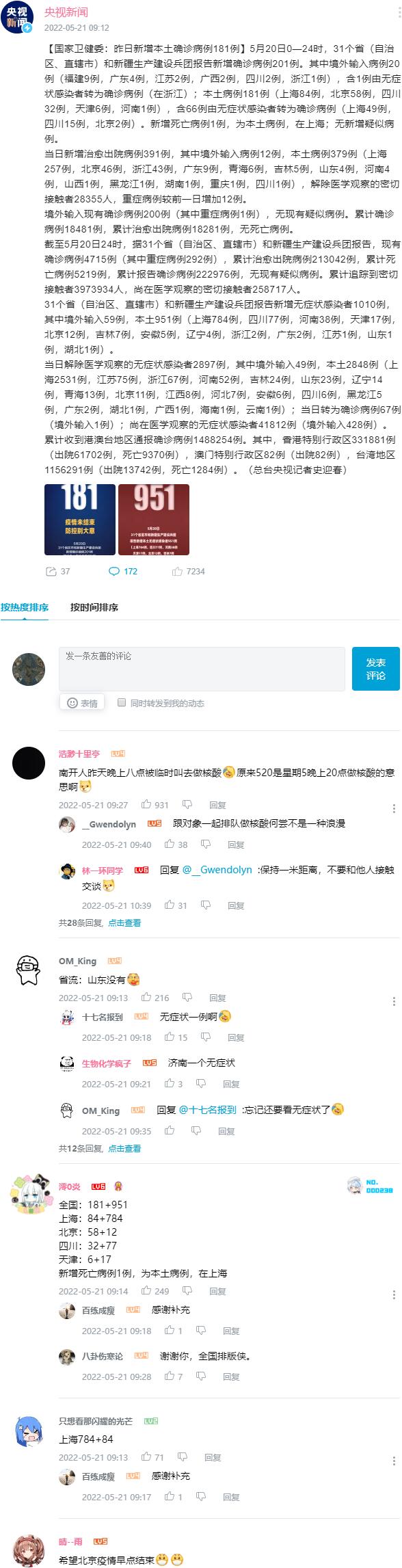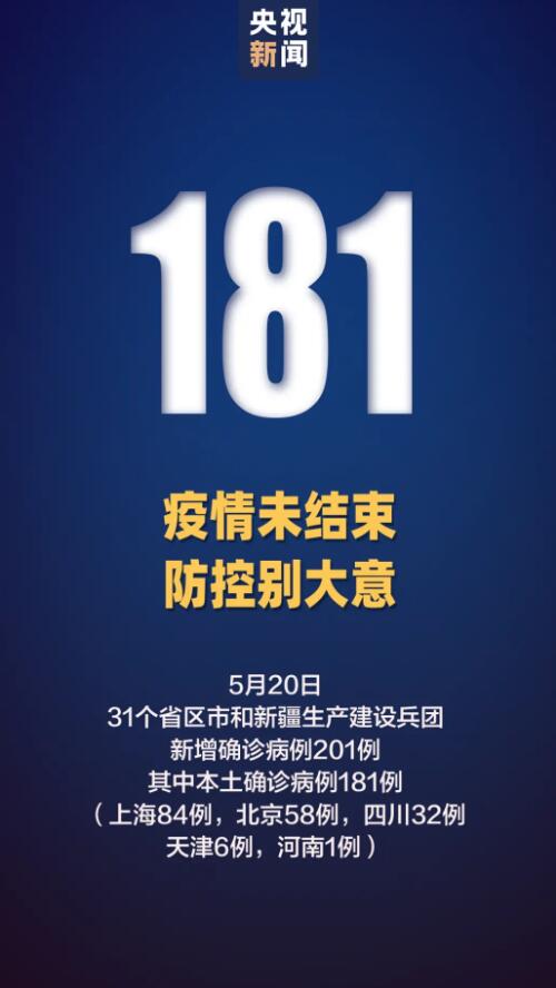 【国家卫健委:昨日新增本土确诊病例181例】5月20日0—24时,31个省(自治区、直辖市)和新疆生产建设兵团报告新增确诊病例201例。其中境外输入病例20例(福建9例,广东4例,江苏2例,广西2例,四川2例,浙江1例),含1例由无症状感染者转为确诊病例(在浙江);本土病例181例(上海84例,北京58例,四川32例,天津6例,河南1例),含66例由无症状感染者转为确诊病例(上海49例,四川15例,北京2例)。新增死亡病例1例,为本土病例,在上海;无新增疑似病例。