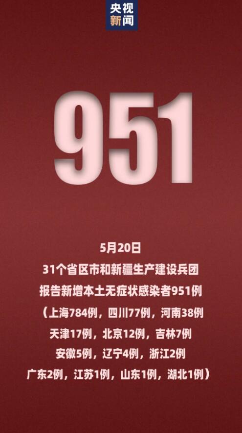 31个省(自治区、直辖市)和新疆生产建设兵团报告新增无症状感染者1010例,其中境外输入59例,本土951例(上海784例,四川77例,河南38例,天津17例,北京12例,吉林7例,安徽5例,辽宁4例,浙江2例,广东2例,江苏1例,山东1例,湖北1例)。