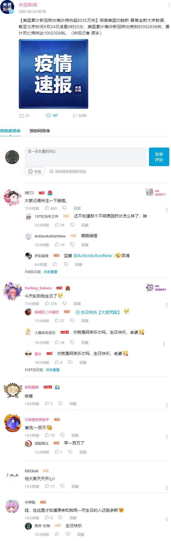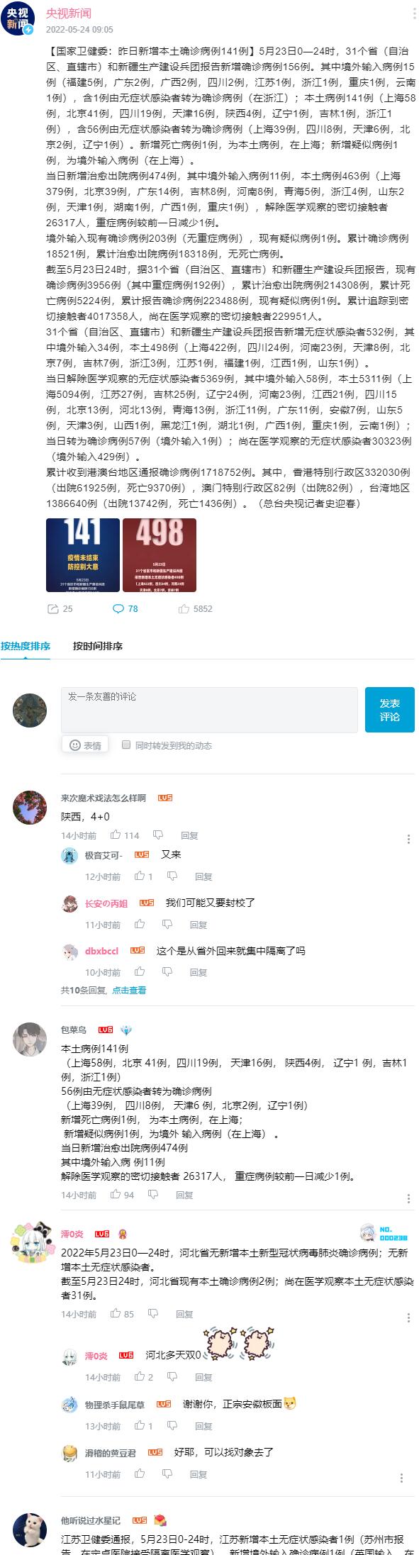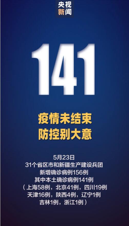 【国家卫健委:昨日新增本土确诊病例141例】5月23日0—24时,31个省(自治区、直辖市)和新疆生产建设兵团报告新增确诊病例156例。其中境外输入病例15例(福建5例,广东2例,广西2例,四川2例,江苏1例,浙江1例,重庆1例,云南1例),含1例由无症状感染者转为确诊病例(在浙江);本土病例141例(上海58例,北京41例,四川19例,天津16例,陕西4例,辽宁1例,吉林1例,浙江1例),含56例由无症状感染者转为确诊病例(上海39例,四川8例,天津6例,北京2例,辽宁1例)。新增死亡病例1例,为本土病例,在上海;新增疑似病例1例,为境外输入病例(在上海)。