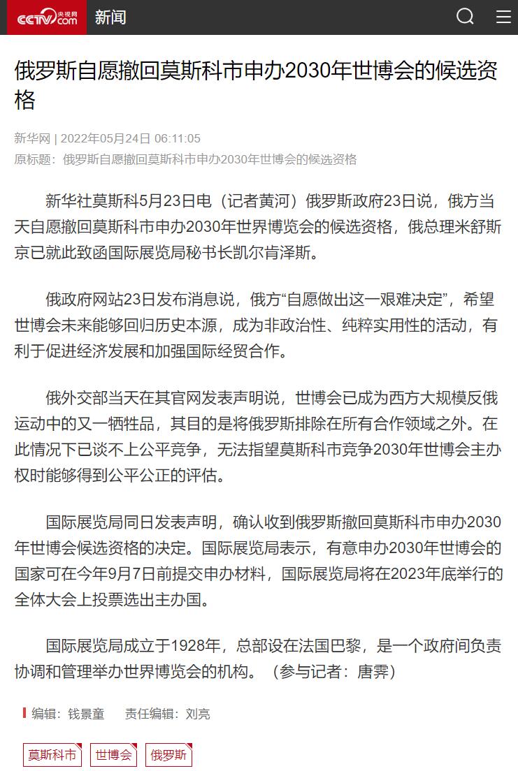 国际展览局同日发表声明,确认收到俄罗斯撤回莫斯科市申办2030年世博会候选资格的决定。国际展览局表示,有意申办2030年世博会的国家可在今年9月7日前提交申办材料,国际展览局将在2023年底举行的全体大会上投票选出主办国。