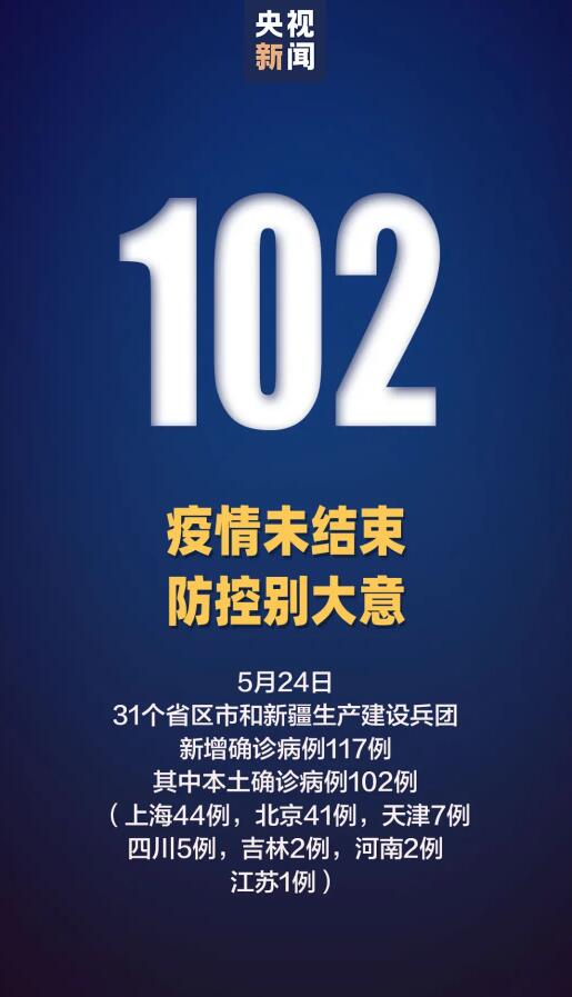 【国家卫健委:昨日新增本土确诊病例102例】5月24日0—24时,31个省(自治区、直辖市)和新疆生产建设兵团报告新增确诊病例117例。其中境外输入病例15例,含1例由无症状感染者转为确诊病例;本土病例102例(上海44例,北京41例,天津7例,四川5例,吉林2例,河南2例,江苏1例),含39例由无症状感染者转为确诊病例(上海32例,北京4例,天津1例,河南1例,四川1例)。无新增死亡病例。无新增疑似病例。