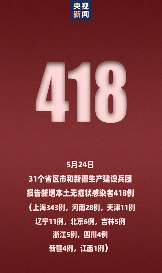 31个省(自治区、直辖市)和新疆生产建设兵团报告新增无症状感染者473例,其中境外输入55例,本土418例(上海343例,河南28例,天津11例,辽宁11例,北京6例,吉林5例,浙江5例,四川4例,新疆4例,江西1例)。