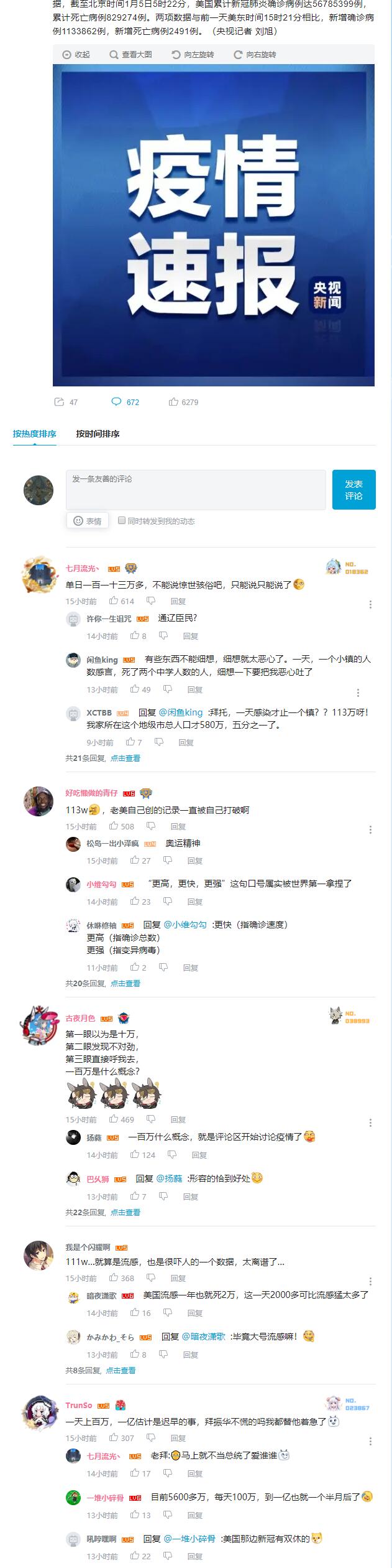 【美国累计新冠肺炎确诊病例超5678万例】根据美国约翰斯·霍普金斯大学的数据,截至北京时间1月5日5时22分,美国累计新冠肺炎确诊病例达56785399例,累计死亡病例829274例。两项数据与前一天美东时间15时21分相比,新增确诊病例1133862例,新增死亡病例2491例。(央视记者 刘旭)