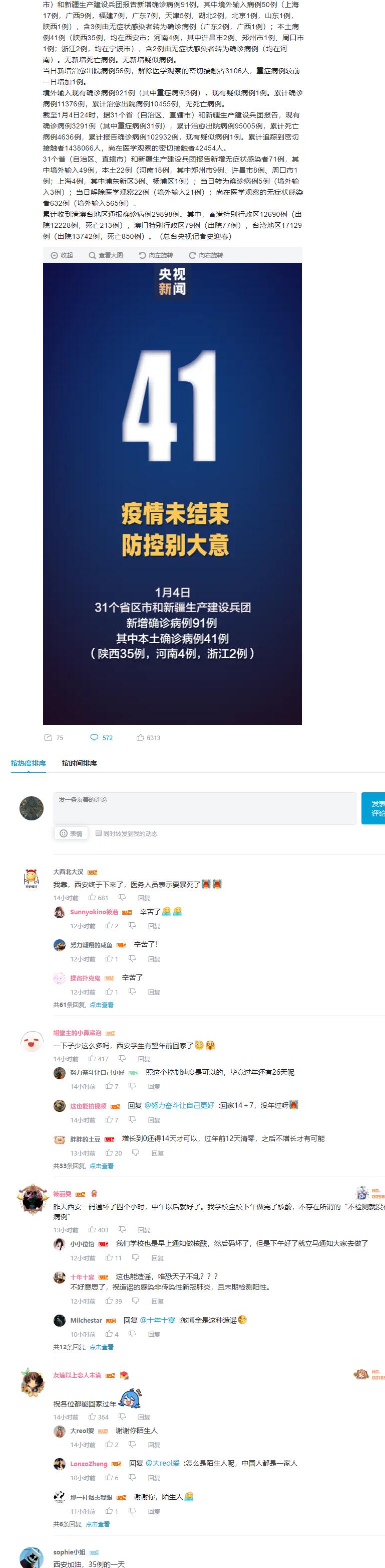 【31省区市新增本土确诊病例41例】1月4日0—24时,31个省(自治区、直辖市)和新疆生产建设兵团报告新增确诊病例91例。其中境外输入病例50例(上海17例,广西9例,福建7例,广东7例,天津5例,湖北2例,北京1例,山东1例,陕西1例),含3例由无症状感染者转为确诊病例(广东2例,广西1例);本土病例41例(陕西35例,均在西安市;河南4例,其中许昌市2例、郑州市1例、周口市1例;浙江2例,均在宁波市),含2例由无症状感染者转为确诊病例(均在河南)。无新增死亡病例。无新增疑似病例。