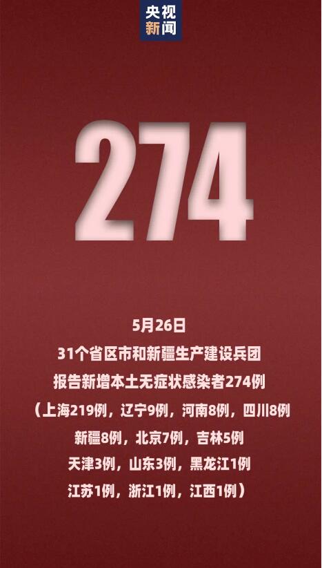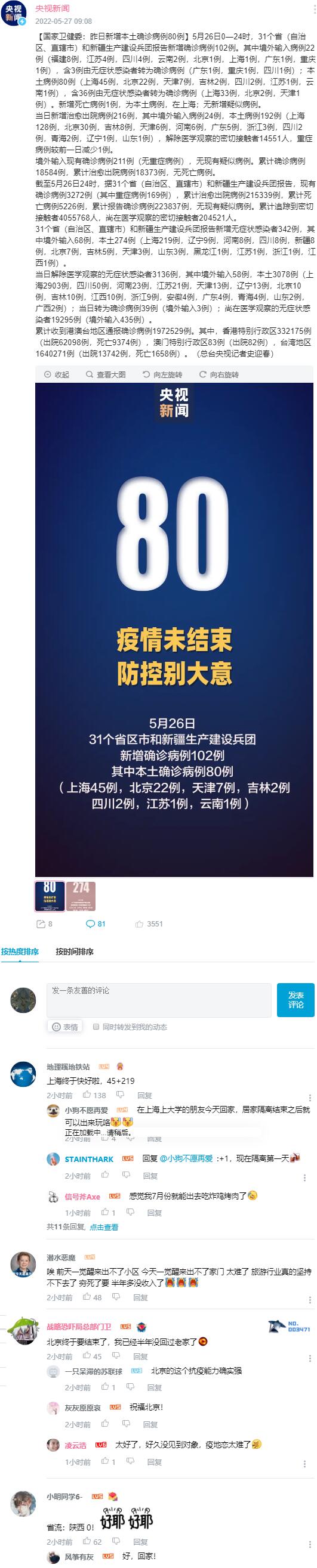【国家卫健委:昨日新增本土确诊病例80例】5月26日0—24时,31个省(自治区、直辖市)和新疆生产建设兵团报告新增确诊病例102例。其中境外输入病例22例(福建8例,江苏4例,四川4例,云南2例,北京1例,上海1例,广东1例,重庆1例),含3例由无症状感染者转为确诊病例(广东1例,重庆1例,四川1例);本土病例80例(上海45例,北京22例,天津7例,吉林2例,四川2例,江苏1例,云南1例),含36例由无症状感染者转为确诊病例(上海33例,北京2例,天津1例)。新增死亡病例1例,为本土病例,在上海;无新增疑似病例。
