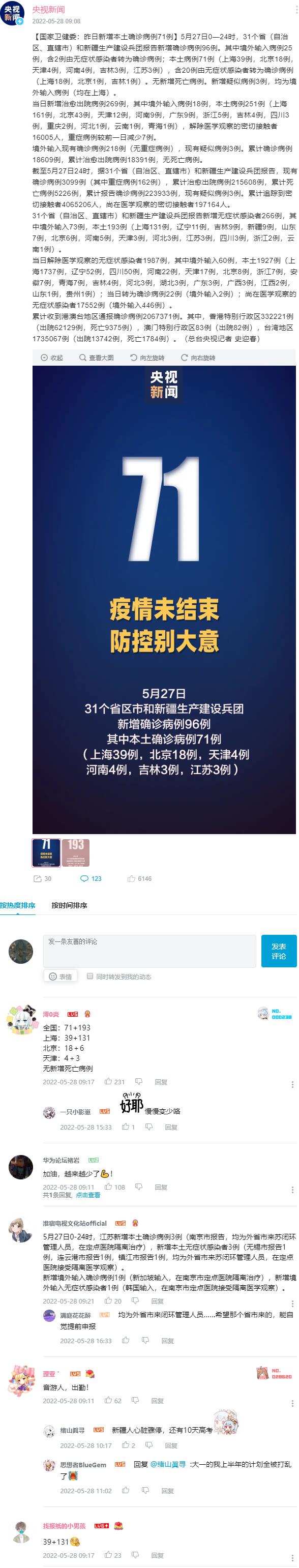 【国家卫健委:昨日新增本土确诊病例71例】5月27日0—24时,31个省(自治区、直辖市)和新疆生产建设兵团报告新增确诊病例96例。其中境外输入病例25例,含2例由无症状感染者转为确诊病例;本土病例71例(上海39例,北京18例,天津4例,河南4例,吉林3例,江苏3例),含20例由无症状感染者转为确诊病例(上海18例,北京1例,吉林1例)。无新增死亡病例。新增疑似病例3例,均为境外输入病例(均在上海)。