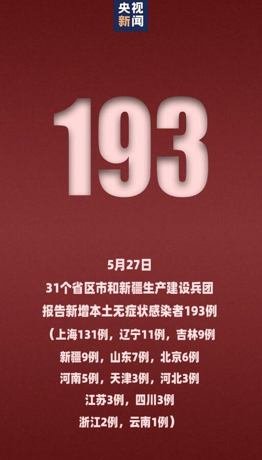 截至5月27日24时,据31个省(自治区、直辖市)和新疆生产建设兵团报告,现有确诊病例3099例(其中重症病例162例),累计治愈出院病例215608例,累计死亡病例5226例,累计报告确诊病例223933例,现有疑似病例3例。累计追踪到密切接触者4065206人,尚在医学观察的密切接触者197164人。