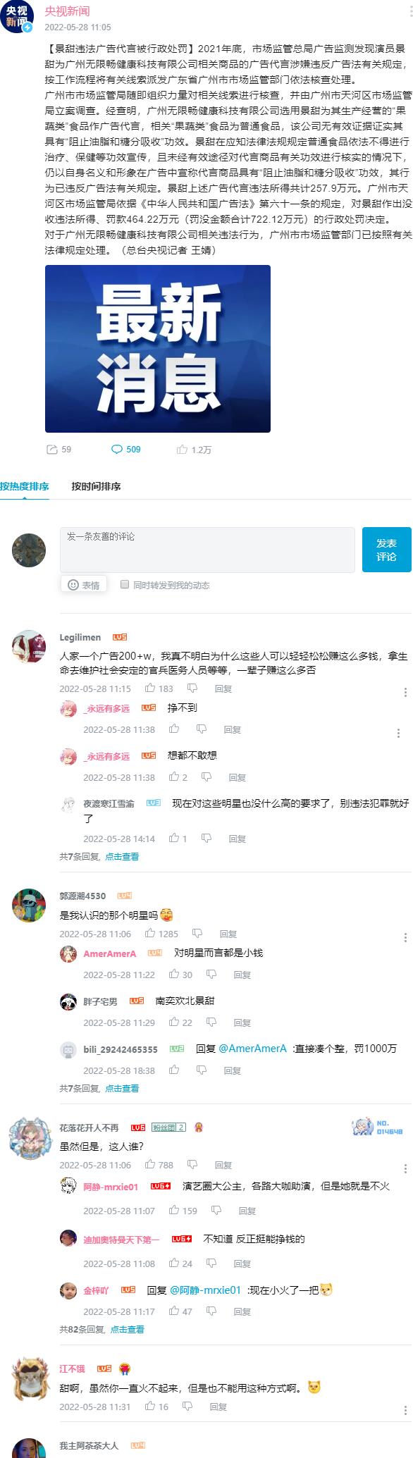 【景甜违法广告代言被行政处罚】2021年底,市场监管总局广告监测发现演员景甜为广州无限畅健康科技有限公司相关商品的广告代言涉嫌违反广告法有关规定,按工作流程将有关线索派发广东省广州市市场监管部门依法核查处理。
