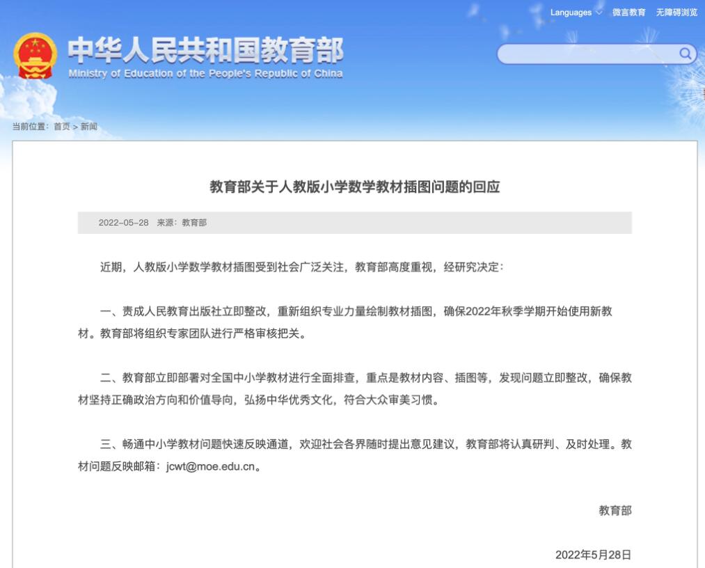 一、责成人民教育出版社立即整改,重新组织专业力量绘制教材插图,确保2022年秋季学期开始使用新教材。教育部将组织专家团队进行严格审核把关。