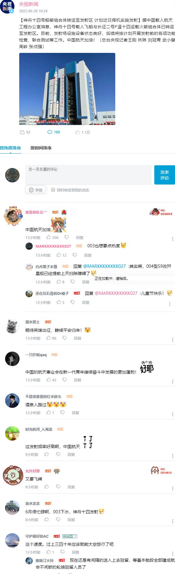 ★★★ 神舟十四号船箭组合体转运至发射区 计划近日择机实施发射