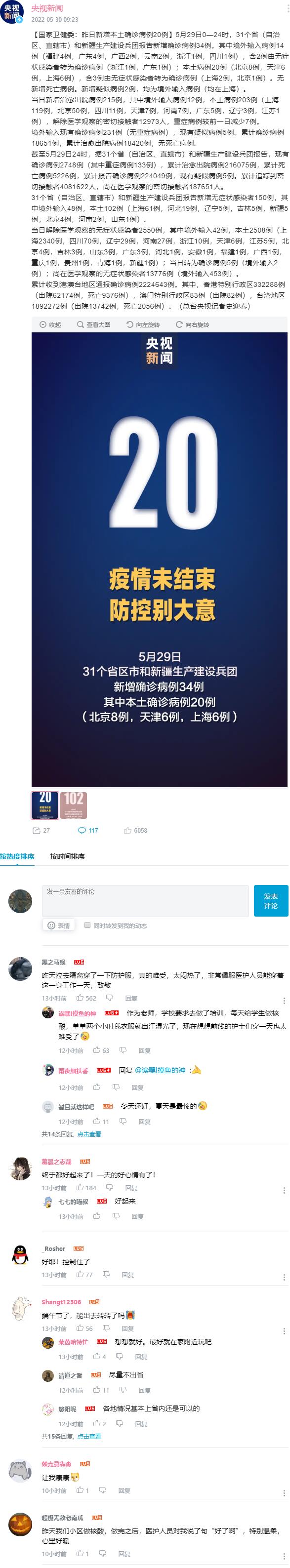 【国家卫健委:昨日新增本土确诊病例20例】5月29日0—24时,31个省(自治区、直辖市)和新疆生产建设兵团报告新增确诊病例34例。其中境外输入病例14例(福建4例,广东4例,广西2例,云南2例,浙江1例,四川1例),含2例由无症状感染者转为确诊病例(浙江1例,广东1例);本土病例20例(北京8例,天津6例,上海6例),含3例由无症状感染者转为确诊病例(上海2例,北京1例)。无新增死亡病例。新增疑似病例2例,均为境外输入病例(均在上海)。