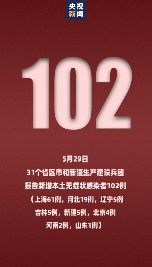 31个省(自治区、直辖市)和新疆生产建设兵团报告新增无症状感染者150例,其中境外输入48例,本土102例(上海61例,河北19例,辽宁5例,吉林5例,新疆5例,北京4例,河南2例,山东1例)。