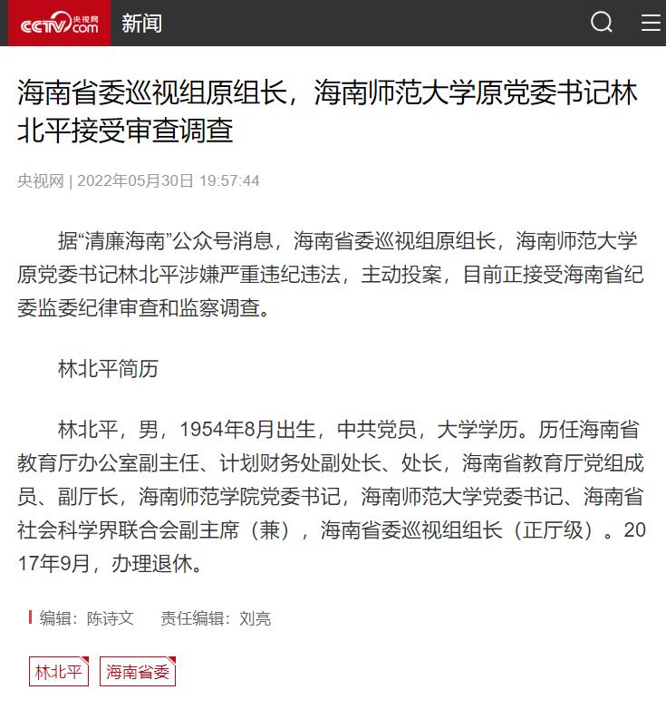 ★★★ 海南省委巡视组原组长,海南师范大学原党委书记林北平接受审查调查