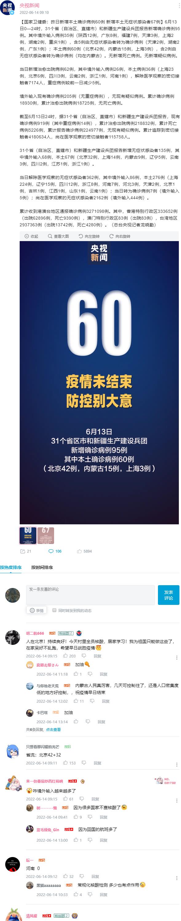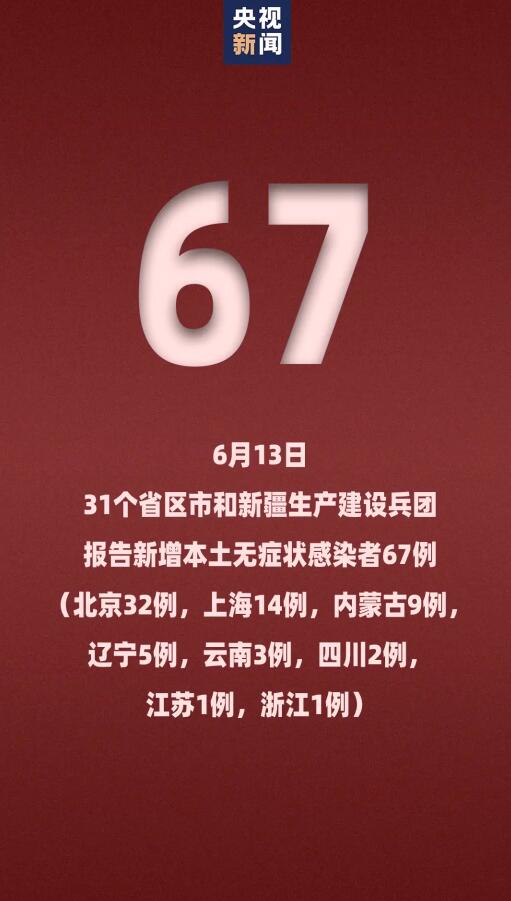 【国家卫健委:昨日新增本土确诊病例60例 新增本土无症状感染者67例】6月13日0—24时,31个省(自治区、直辖市)和新疆生产建设兵团报告新增确诊病例95例。其中境外输入病例35例(陕西12例,广东8例,福建7例,天津3例,上海2例,湖南2例,重庆1例),含5例由无症状感染者转为确诊病例(天津2例,湖南2例,广东1例);本土病例60例(北京42例,内蒙古15例,上海3例),含2例由无症状感染者转为确诊病例(均在内蒙古)。无新增死亡病例。无新增疑似病例。