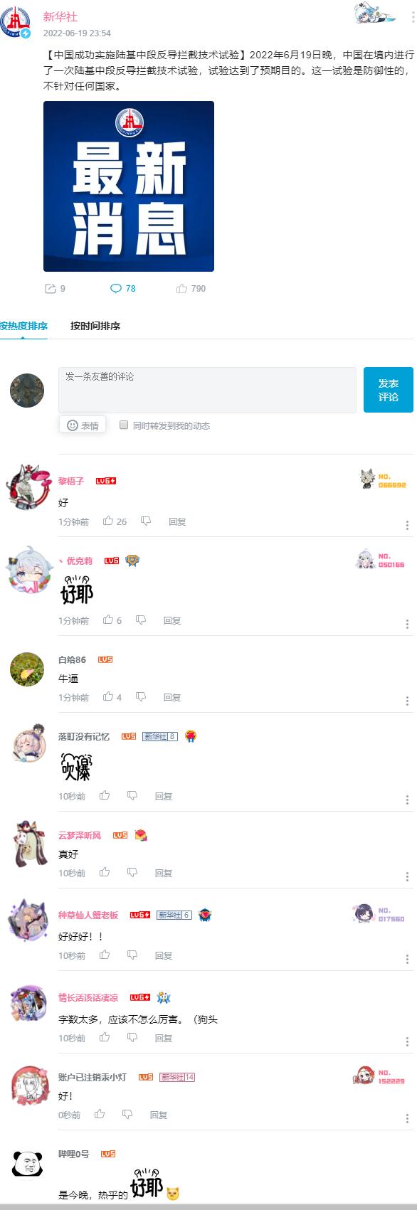 【中国成功实施陆基中段反导拦截技术试验】2022年6月19日晚,中国在境内进行了一次陆基中段反导拦截技术试验,试验达到了预期目的。这一试验是防御性的,不针对任何国家。