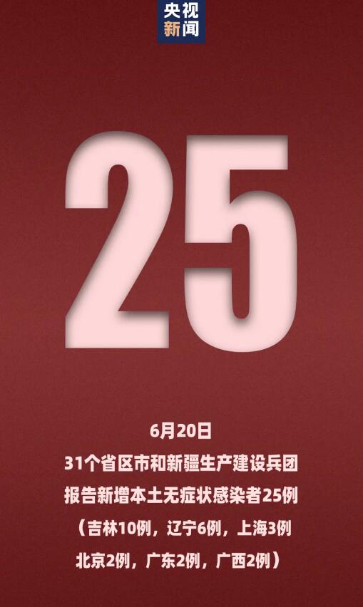 31个省(自治区、直辖市)和新疆生产建设兵团报告新增无症状感染者105例,其中境外输入80例,本土25例(吉林10例,辽宁6例,上海3例,北京2例,广东2例,广西2例)。