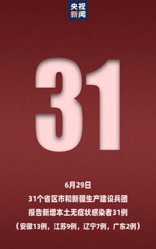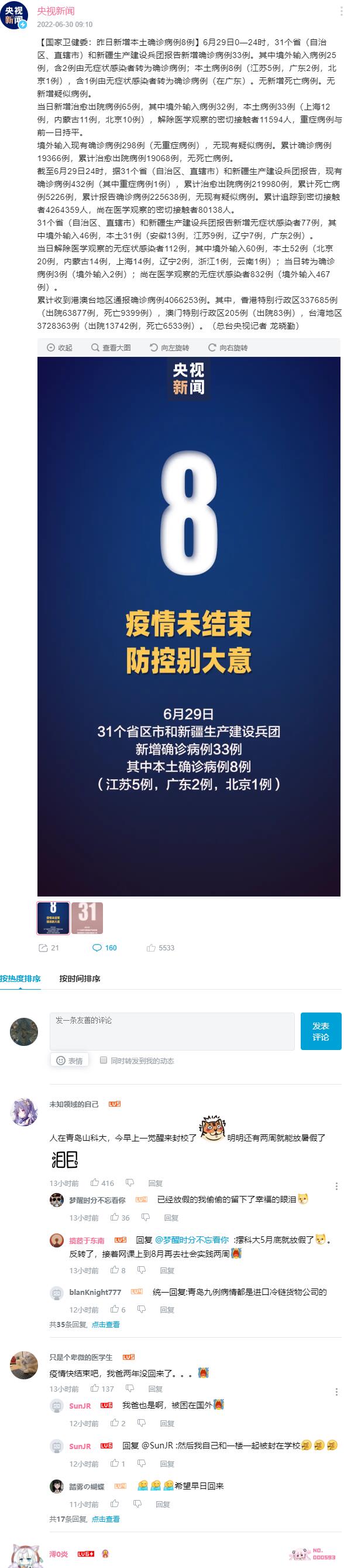 【国家卫健委:昨日新增本土确诊病例8例】6月29日0—24时,31个省(自治区、直辖市)和新疆生产建设兵团报告新增确诊病例33例。其中境外输入病例25例,含2例由无症状感染者转为确诊病例;本土病例8例(江苏5例,广东2例,北京1例),含1例由无症状感染者转为确诊病例(在广东)。无新增死亡病例。无新增疑似病例。