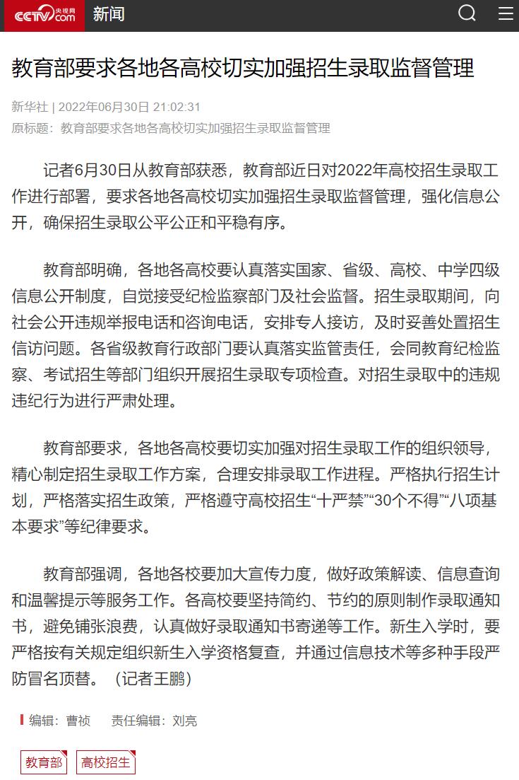 记者6月30日从教育部获悉,教育部近日对2022年高校招生录取工作进行部署,要求各地各高校切实加强招生录取监督管理,强化信息公开,确保招生录取公平公正和平稳有序。