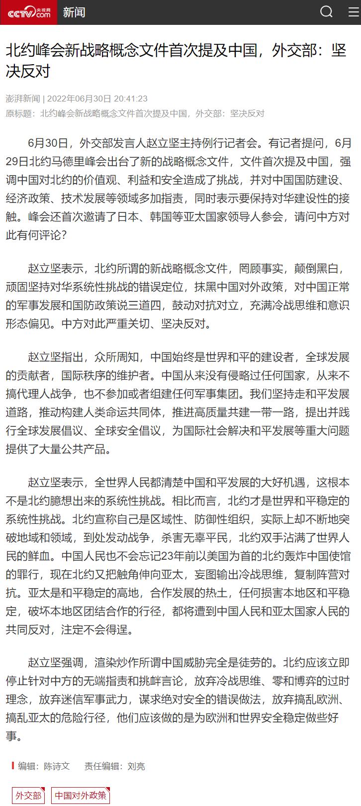 6月30日,外交部发言人赵立坚主持例行记者会。有记者提问,6月29日北约马德里峰会出台了新的战略概念文件,文件首次提及中国,强调中国对北约的价值观、利益和安全造成了挑战,并对中国国防建设、经济政策、技术发展等领域多加指责,同时表示要保持对华建设性的接触。峰会还首次邀请了日本、韩国等亚太国家领导人参会,请问中方对此有何评论?