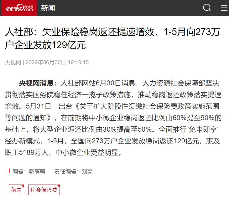 ★★★ 人社部:失业保险稳岗返还提速增效,1-5月向273万户企业发放129亿元