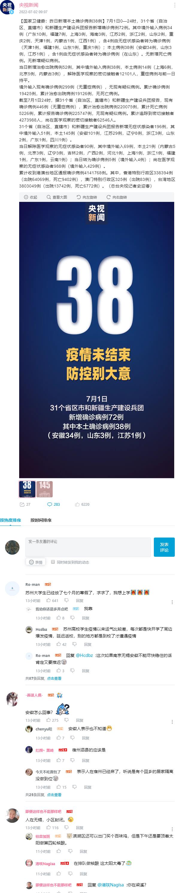 【国家卫健委:昨日新增本土确诊病例38例】7月1日0—24时,31个省(自治区、直辖市)和新疆生产建设兵团报告新增确诊病例72例。其中境外输入病例34例(广东10例,福建7例,上海3例,海南3例,江苏2例,浙江2例,山东2例,重庆2例,天津1例,内蒙古1例,江西1例),含4例由无症状感染者转为确诊病例(天津1例,福建1例,山东1例,重庆1例);本土病例38例(安徽34例,山东3例,江苏1例),含1例由无症状感染者转为确诊病例(在山东)。无新增死亡病例。无新增疑似病例。