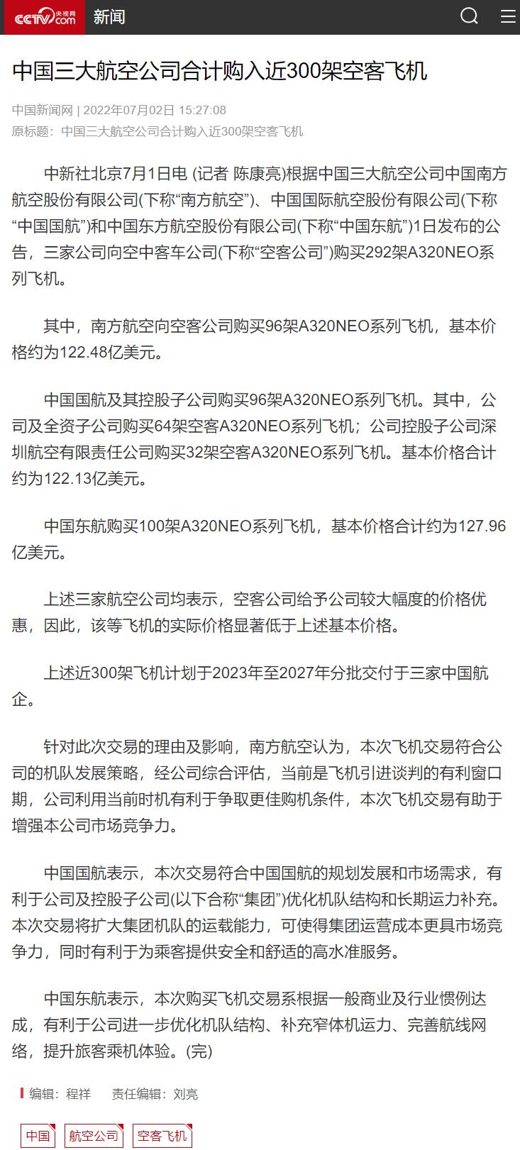 中新社北京7月1日电 (记者 陈康亮)根据中国三大航空公司中国南方航空股份有限公司(下称“南方航空”)、中国国际航空股份有限公司(下称“中国国航”)和中国东方航空股份有限公司(下称“中国东航”)1日发布的公告,三家公司向空中客车公司(下称“空客公司”)购买292架A320NEO系列飞机。