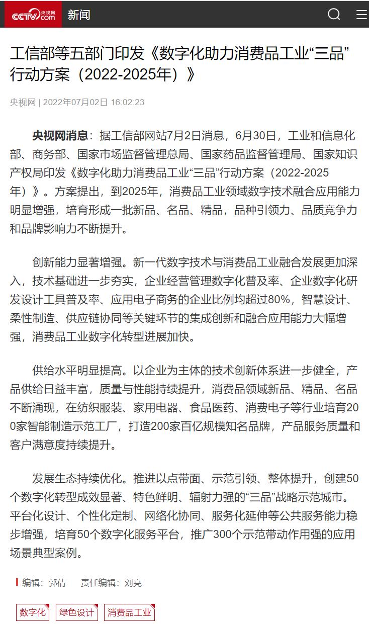 ★★★ 工信部等五部门印发《数字化助力消费品工业“三品”行动方案(2022-2025年)》
