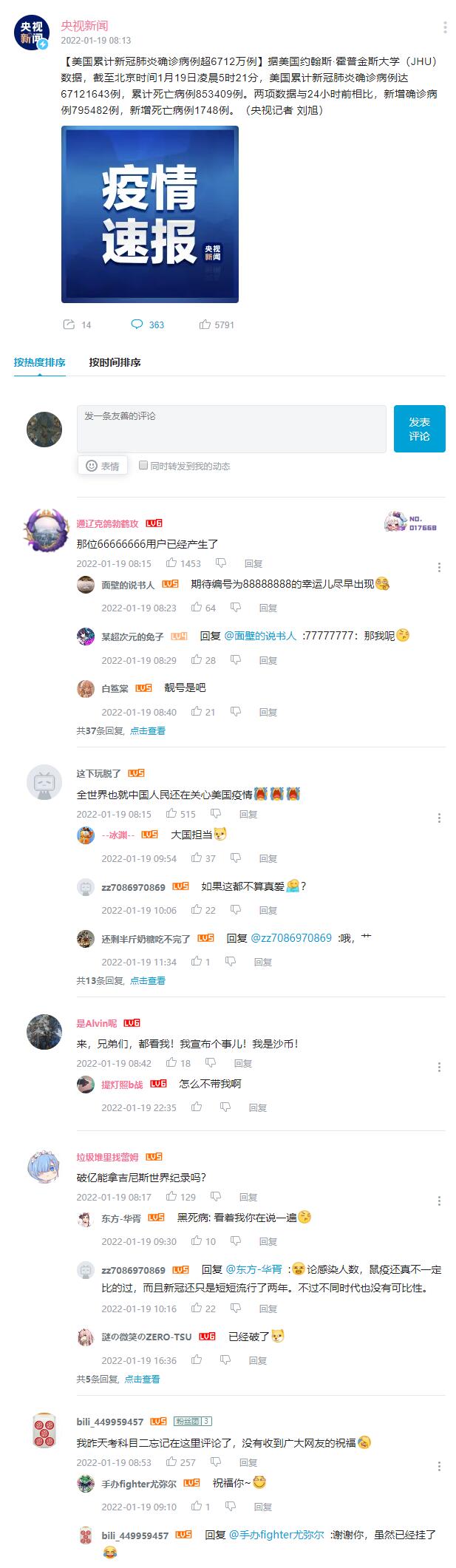 【美国累计新冠肺炎确诊病例超6712万例】据美国约翰斯·霍普金斯大学(JHU)数据,截至北京时间1月19日凌晨5时21分,美国累计新冠肺炎确诊病例达67121643例,累计死亡病例853409例。两项数据与24小时前相比,新增确诊病例795482例,新增死亡病例1748例。(央视记者 刘旭)