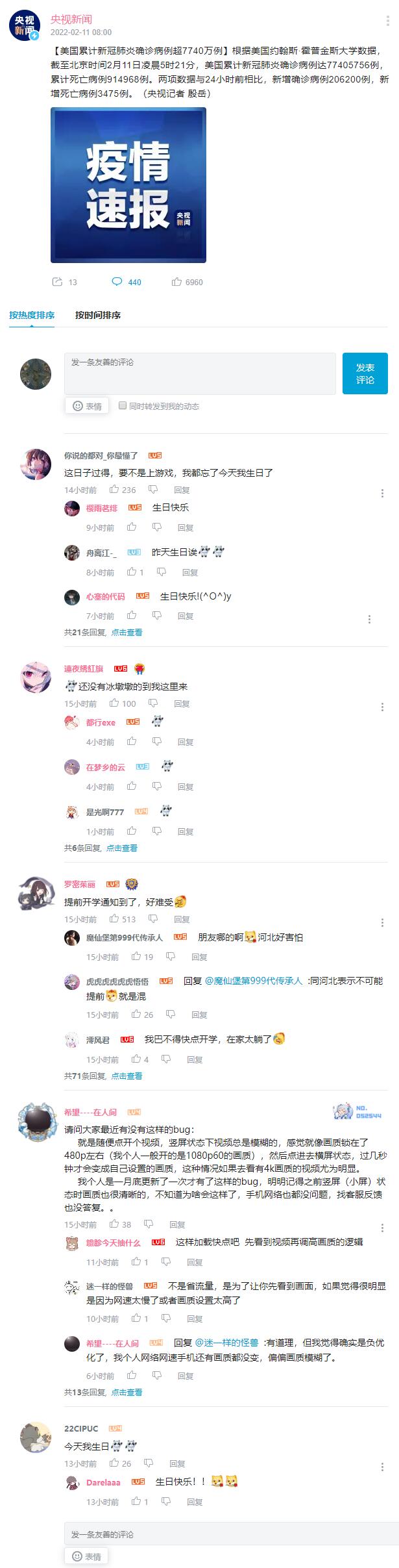 【美国累计新冠肺炎确诊病例超7740万例】根据美国约翰斯·霍普金斯大学数据,截至北京时间2月11日凌晨5时21分,美国累计新冠肺炎确诊病例达77405756例,累计死亡病例914968例。两项数据与24小时前相比,新增确诊病例206200例,新增死亡病例3475例。(央视记者 殷岳