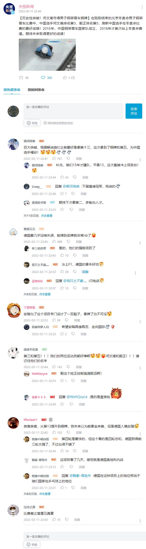 【历史性突破!闫文港夺得男子钢架雪车铜牌】在刚刚结束的北京冬奥会男子钢架雪车比赛中,中国选手闫文港排名第3,殷正排名第5,刷新中国选手在冬奥会比赛的最好成绩!2015年,中国钢架雪车国家队成立, 2018年才首次站上冬奥会赛道。期待未来取得更好的成绩!