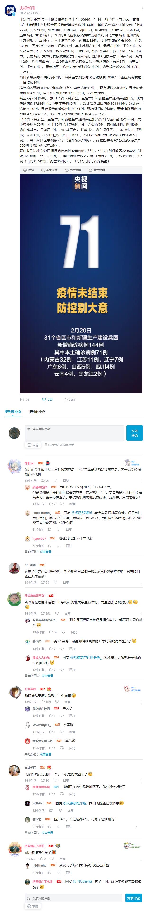 【31省区市新增本土确诊病例71例】2月20日0—24时,31个省(自治区、直辖市)和新疆生产建设兵团报告新增确诊病例144例。其中境外输入病例73例(上海27例,广东20例,北京9例,广西5例,四川5例,福建3例,天津1例,江苏1例,重庆1例,甘肃1例),含7例由无症状感染者转为确诊病例(广东3例,四川2例,江苏1例,广西1例);本土病例71例(内蒙古32例,其中呼和浩特市30例、包头市1例、巴彦淖尔市1例;江苏11例,其中苏州市10例、无锡市1例;辽宁7例,均在葫芦岛市;广东6例,均在深圳市;山西5例,均在晋中市;四川4例,均在成都市;云南4例,其中德宏傣族景颇族自治州3例、红河哈尼族彝族自治州1例;黑龙江2例,均在鸡西市),含5例由无症状感染者转为确诊病例(云南3例,内蒙古1例,江苏1例)。无新增死亡病例。新增疑似病例3例,均为境外输入病例(均在上海)。