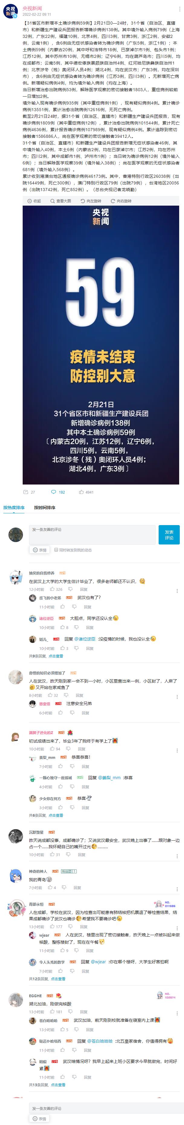 【31省区市新增本土确诊病例59例】2月21日0—24时,31个省(自治区、直辖市)和新疆生产建设兵团报告新增确诊病例138例。其中境外输入病例79例(上海32例,广东22例,福建10例,北京4例,四川3例,甘肃3例,浙江2例,安徽2例,云南1例),含6例由无症状感染者转为确诊病例(广东5例,浙江1例);本土病例59例(内蒙古20例,其中呼和浩特市18例、巴彦淖尔市1例、包头市1例;江苏12例,其中苏州市10例、无锡市2例;辽宁6例,均在葫芦岛市;四川5例,均在成都市;云南5例,其中德宏傣族景颇族自治州4例、红河哈尼族彝族自治州1例;北京涉冬(残)奥闭环人员4例;湖北4例,均在武汉市;广东3例,均在深圳市),含6例由无症状感染者转为确诊病例(江苏3例,四川3例)。无新增死亡病例。新增疑似病例4例,均为境外输入病例(均在上海)。