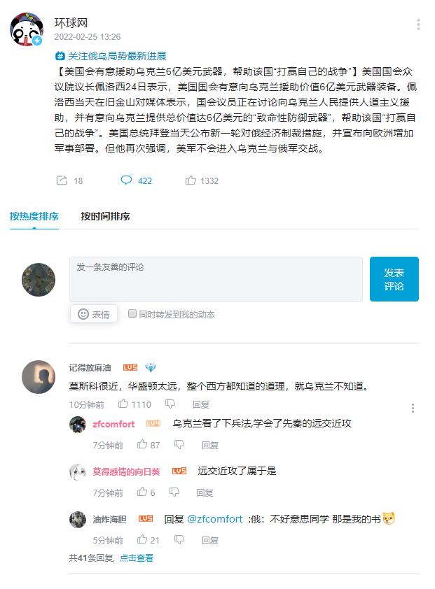 【美国会有意援助乌克兰6亿美元武器,帮助该国“打赢自己的战争”】美国国会众议院议长佩洛西24日表示,美国国会有意向乌克兰援助价值6亿美元武器装备。佩洛西当天在旧金山对媒体表示,国会议员正在讨论向乌克兰人民提供人道主义援助,并有意向乌克兰提供总价值达6亿美元的“致命性防御武器”,帮助该国“打赢自己的战争”。美国总统拜登当天公布新一轮对俄经济制裁措施,并宣布向欧洲增加军事部署。但他再次强调,美军不会进入乌克兰与俄军交战。