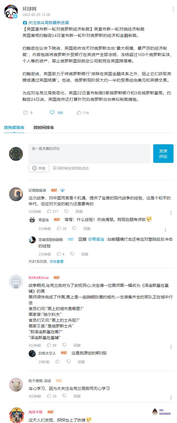 约翰逊在议会下院说,英国政府当天对俄罗斯出台“最大规模、最严厉的经济制裁”,内容包括将俄罗斯外贸银行在英资产全部冻结,冻结超过100个俄罗斯实体、个人等的资产,禁止俄罗斯国际航空公司航班在英国降落等。