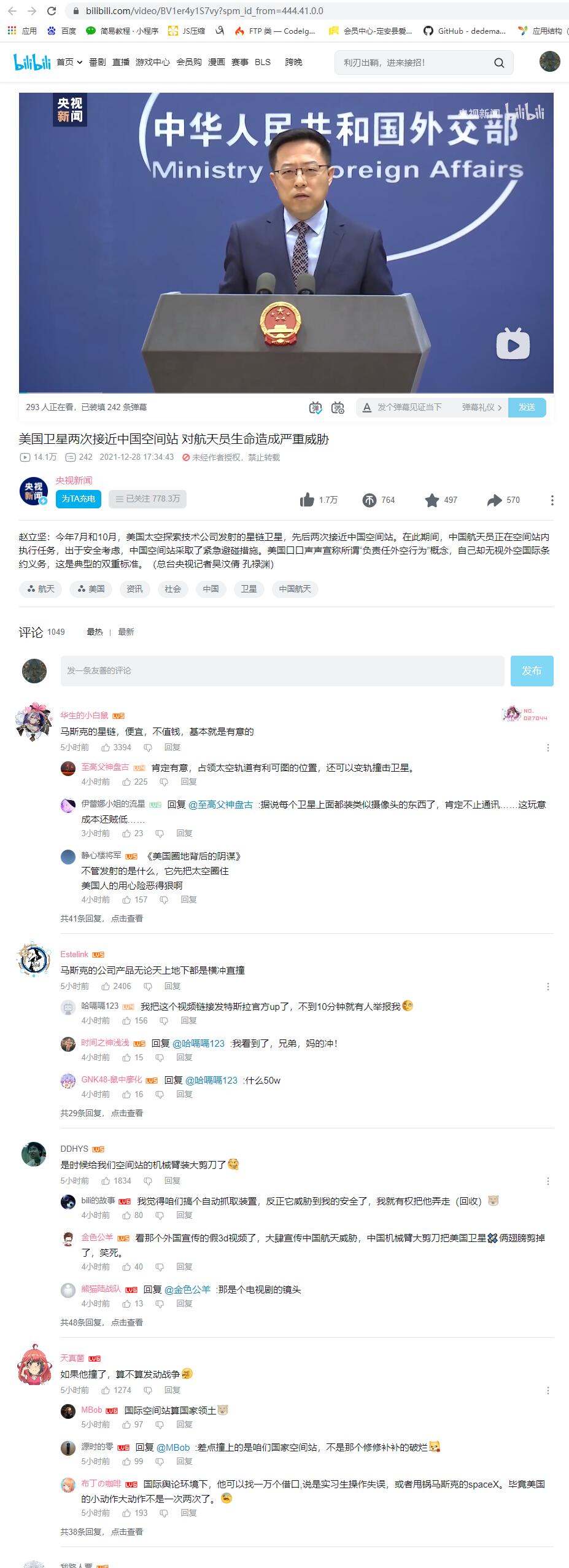 赵立坚:今年7月和10月,美国太空探索技术公司发射的星链卫星,先后两次接近中国空间站。在此期间,中国航天员正在空间站内执行任务,出于安全考虑,中国空间站采取了紧急避碰措施。美国口口声声宣称所谓“负责任外空行为”概念,自己却无视外空国际条约义务,这是典型的双重标准。(总台央视记者吴汶倩 孔禄渊)