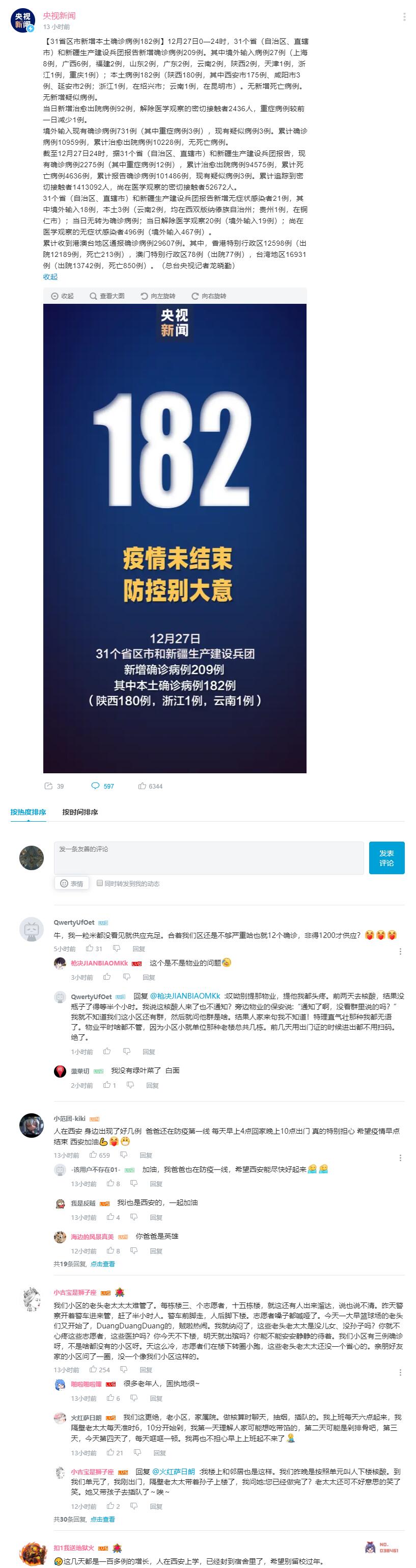 【31省区市新增本土确诊病例182例】12月27日0—24时,31个省(自治区、直辖市)和新疆生产建设兵团报告新增确诊病例209例。其中境外输入病例27例(上海8例,广西6例,福建2例,山东2例,广东2例,云南2例,陕西2例,天津1例,浙江1例,重庆1例);本土病例182例(陕西180例,其中西安市175例、咸阳市3例、延安市2例;浙江1例,在绍兴市;云南1例,在昆明市)。无新增死亡病例。无新增疑似病例。