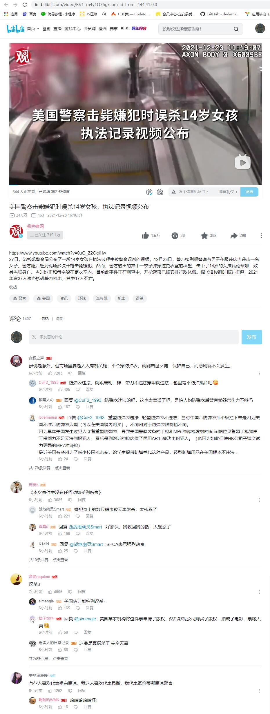 27日,洛杉矶警察局公布了一段14岁女孩在执法过程中被警察误杀的视频。12月23日,警方接到报警说有男子在服装店内袭击一名女子。警方随后赶到现场多次开枪击毙嫌犯,然而,警方射出的其中一枚子弹穿过更衣室的墙壁,击中了14岁的女孩瓦伦蒂娜,致其当场身亡。当时她正和母亲躲在更衣室内。目前此事件正在调查中,开枪警察已被安排行政休假。据《洛杉矶时报》报道,2021年有37人遭洛杉矶警方枪击,其中17人死亡。
